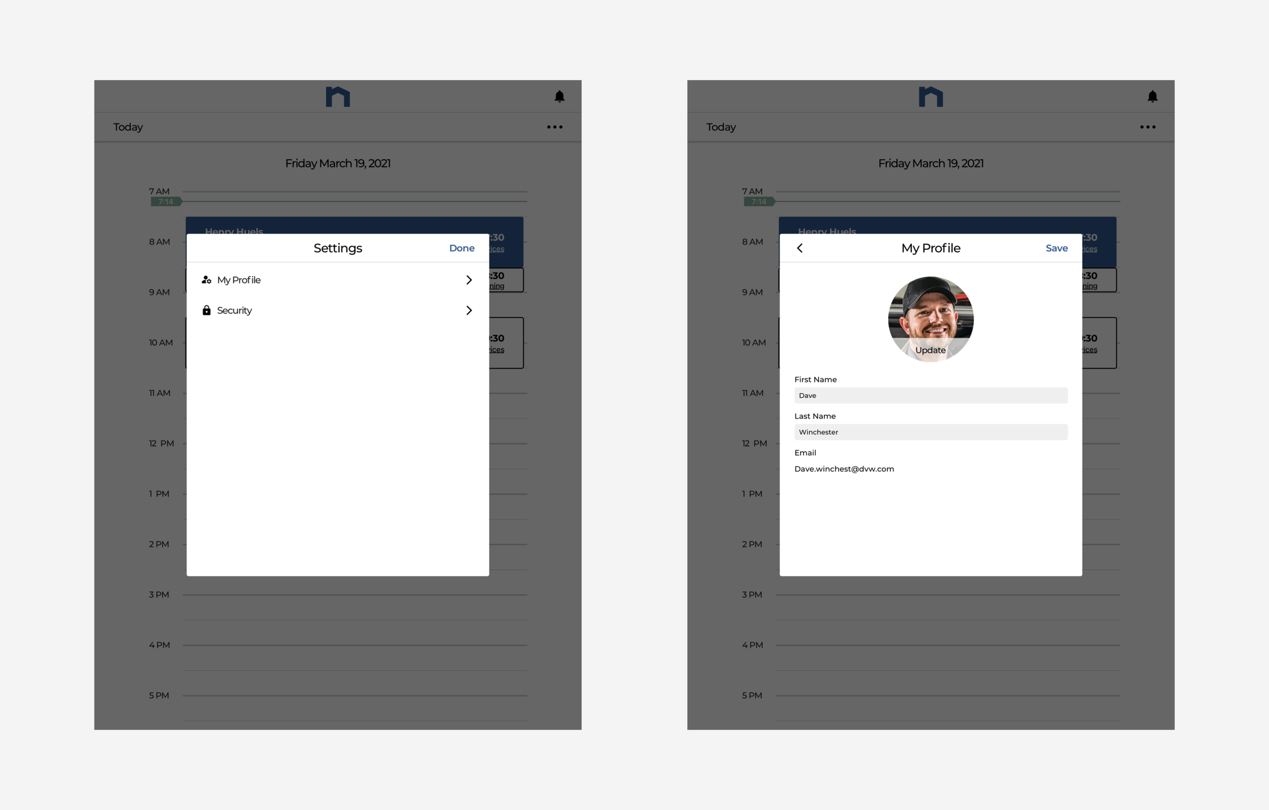 After signing in, users will land on the "Today” screen, where the field service technician would be able to view and access all the appointments for that day. The menu screens on the left show my design implementations after receiving the designs (since this structure was already developed) and the screens on the right show my proposed placement of the navigation menu—to be implemented at a later PI.
